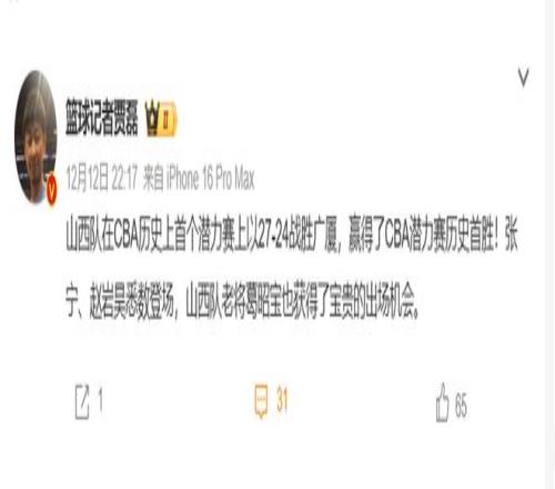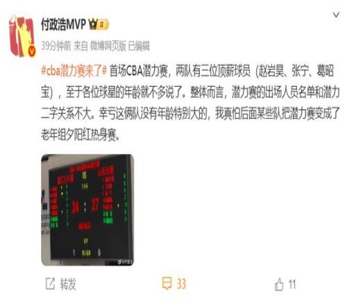 篮球记者贾磊,在赛后也暗讽了一番潜力赛:山西队在CBA历史上首个潜力赛上以27-24战胜广厦,赢得了CBA潜力赛历史首胜!张宁、赵岩昊悉数登场,山西队老将葛昭宝也获得了宝贵的出场机会。