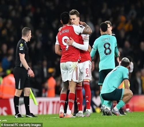 英超第16轮,,阿森纳主场上演补时绝杀,2-1惊险击败狼队,先赛一场暂时领先曼城5分。热苏斯在终场前的头球攻门被倒霉的狼队后卫莫斯克拉挡入自家大门,让阿森纳避免了主场丢分的尴尬。本场比赛,枪手的表现不佳。上半场,球队6次射门无一命中目标;反倒是黄喜灿抓住一次反击机会,迫使大卫·拉亚做出扑救。